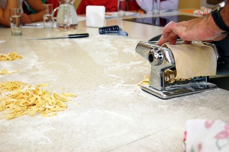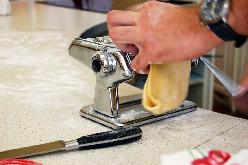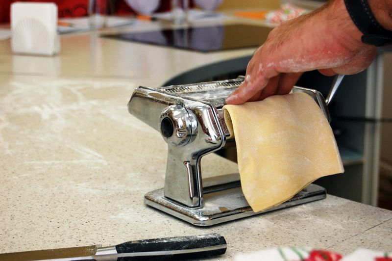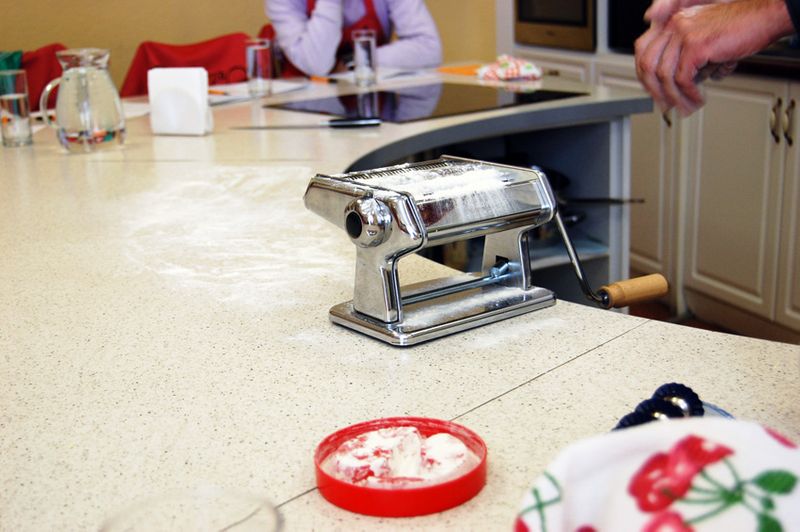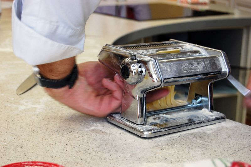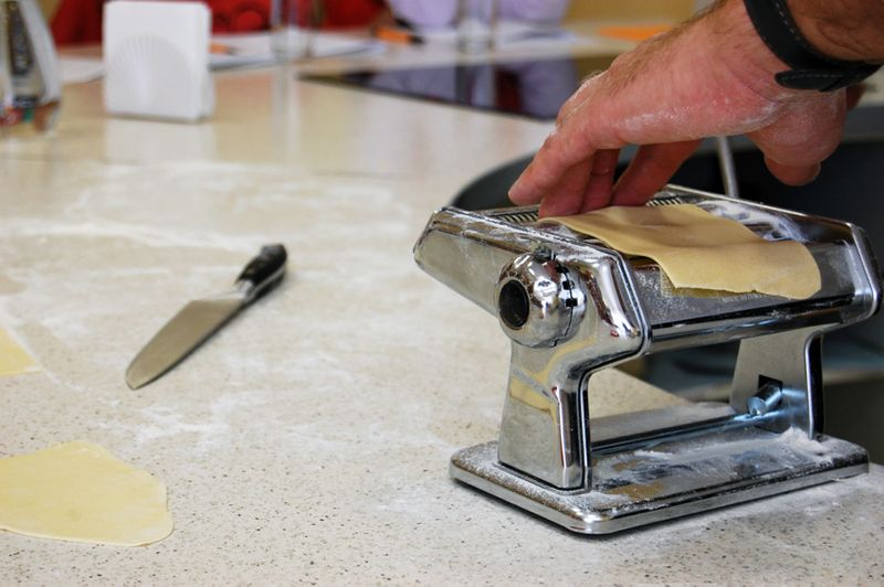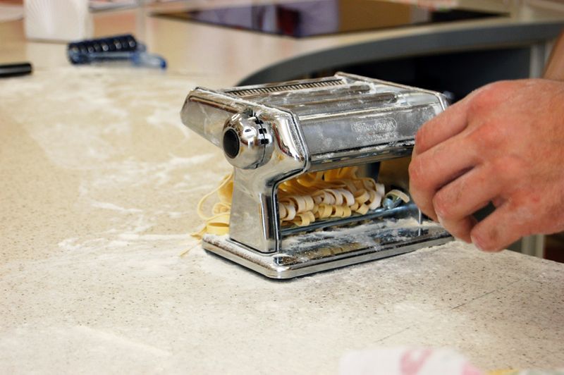 Крепим к столу, присыпаем мукой! К слову, машинку после приготовления пасты мыть не нужно! Только протереть сухой салфеткой.