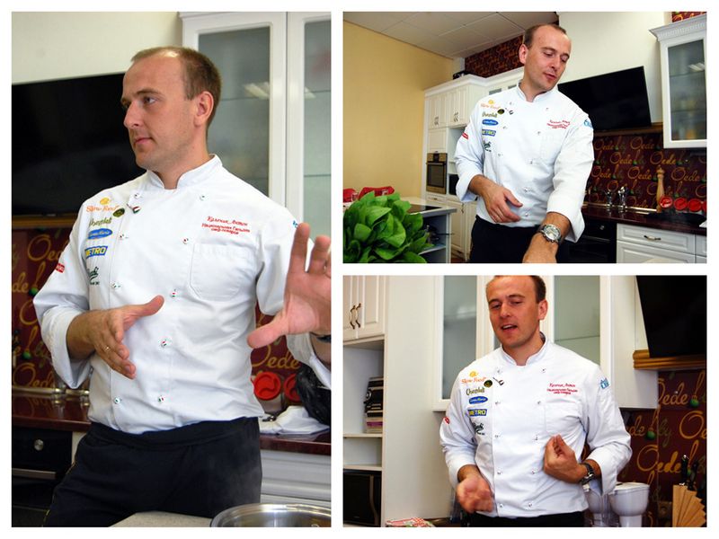 Пока мы ждали всех, Антон рассказывал, как он сам, из холодильника Атлант сделал машину для выдержки мяса (типа маринования без маринада), как воюют за свои кухни Французы и Итальянцы, злой все-таки Гордон Рамзи или милашка))),и не ругается ли на него жена из-за того, что работа для него - это жизнь) На последнем вопросе я начинаю вспоминать себя, когда ругаю Милаху, за то, что он так много времени работает, а он мне все время говорит - "это же не работа, крошка!!!! Я на ней не устаю!!" У Антона, видимо, хорошая жена, т.к. выглядит он абсолютно счастливым))) Кстати, рабочий день у него начинается в 6 утра, а заканчивается в 12 ночи! И так 3 дня подряд, потом выходные. Я даже не представляю, как можно выдержать такой темп!!! А в начале сентября Антон выпустит свою книгу про пасту!!!! Говорит, что сейчас каждое утро идет съемка процесса готовки)))