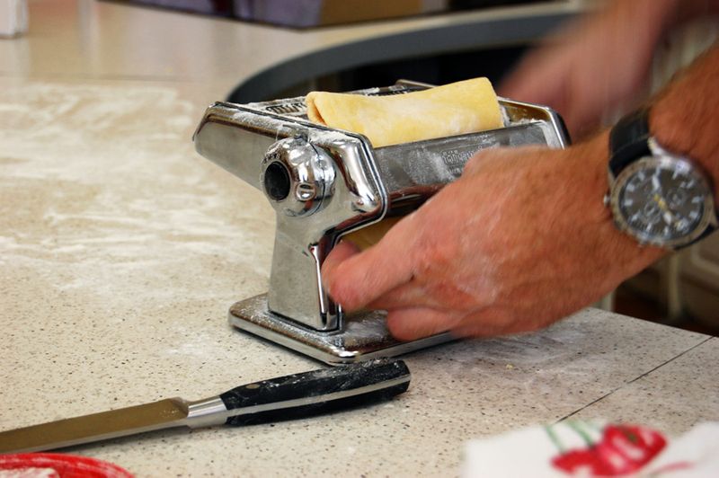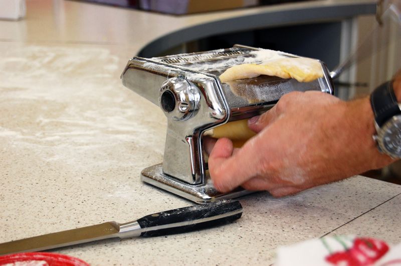 Отрезаем небольшой кусок от теста и начинаем его прогонять через толстое отверстие в машинке (сбоку рычажок регулирует толщину раскатки теста, все в миллиметрах — ставим его на самое большое значение)