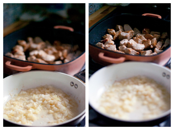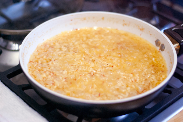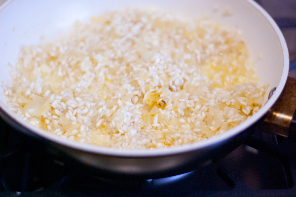 В это время, почистить и мелко нарезать лук, обжарить его в на сковороде в оливковом масле. Рис промыват, пока вода от него не станет кристально-прозрачной (7-10 раз). Воду с риса хорошо слить и добавить его к луку. Дать немного пожариться ~1-2 минуты. Залить горячим бульоном (сразу всем). Постоянно помешивать.
