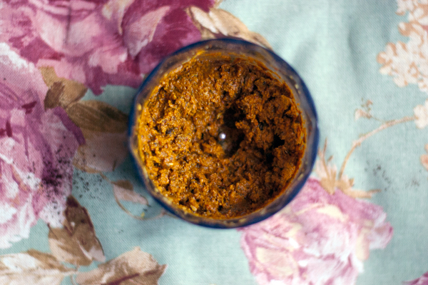 Сначала перемолоть в блендере сухие специи, потом добавить туда цедру, чеснок и имбирь и долить немного воды, чтобы при взбивании получилась кашица.