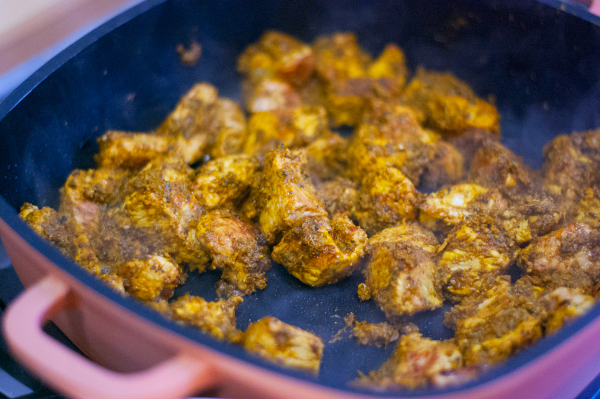 Когда индейка достаточно обжарится, добавить к ней кашицу-карри, перемешать, дать прогреться.