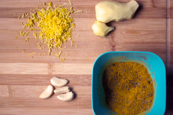 Имбирь помыть и почистить. Натереть цедру лимона, чеснок очистить, Специи смешать в отдельной мисочке.