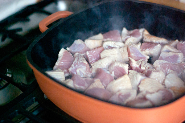 Индейку нарезать кубиками, обжарить в глубокой сковороде без крышки, пока не зарумянится.