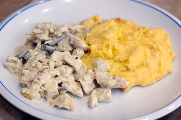 Курица в сливочно-грибном соусе с картофельно-морковным пюре
