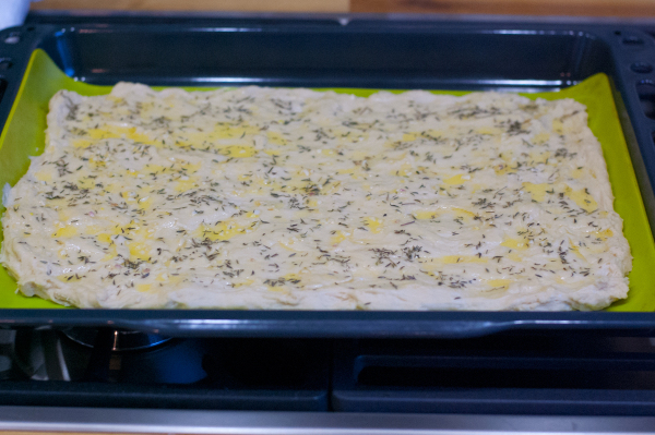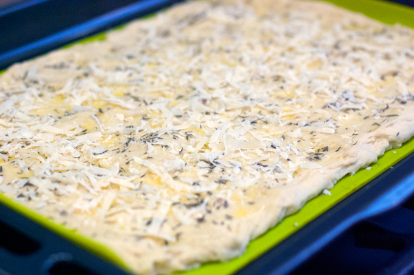 Смешайте измельченный чеснок с размягченным сливочным маслом и смажьте полученной массой тесто. Сверху положите мелко рубленный тимьян и посыпьте тертым сыром.