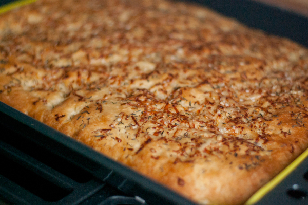 Тем временем нагрейте духовку до 200 C. Снимите пленку с формы, где поднимается тесто, и выпекайте хлеб 30 минут до золотистого цвета и полного таяния сыра. Если сыр подгорает, накройте хлеб фольгой и продолжайте печь.